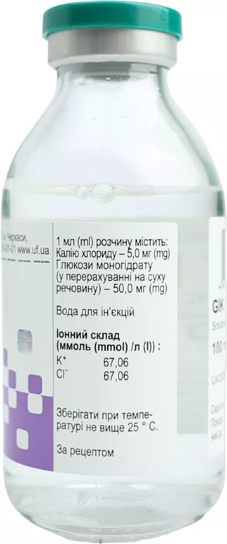 Склад:діючі речовини: 1 мл розчину містить калію хлориду 5,0 мг, глюкози моногідрат (у перерахуванні на суху речовину) 50,0 мг;