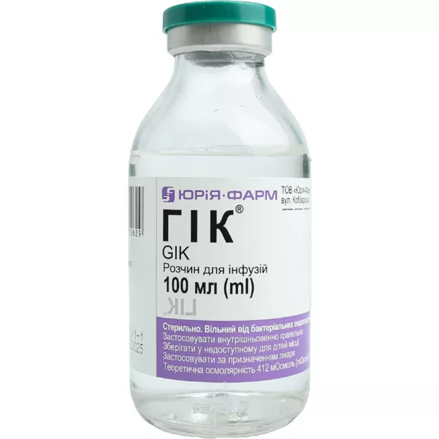 Взаємодія з іншими лікарськими засобами та інші види взаємодій.Препарат поліпшує переносимість серцевих глікозидів, що дозволяє при необхідності одночасно вводити строфантин або препарати наперстянки. При одночасному застосуванні з тіазидними діуретиками і фуросемідом слід враховувати їх здатність впливати на рівень глюкози у сироватці крові. Калійзберігаючі діуретики, інгібітори АПФ, триметоприм збільшують ризик розвитку гіперкаліємії, що потребує контролю рівня калію у крові при їх одночасному застосуванні з розчином ГІК®. Застосування інсуліну одночасно з розчином ГІК® при порушенні серцевого ритму, зумовлених гіпокаліємією, сприяє реполяризації клітин серця та потраплянню глюкози у периферичні тканини. Глюкоза, яка міститься у складі ГІК®, зменшує токсичний вплив піразинаміду на печінку.