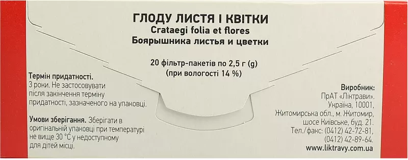 Термін придатності. 3 роки. Не застосовувати після закінчення терміну придатності, зазначеного на упаковці. Умови зберігання. Зберігати в оригінальній упаковці при температурі не вище 30 ºС у недоступному для дітей місці. Упаковка. По 50 г або по 60 г у пачках з внутрішнім пакетом; по 1,5 г або по 2,5 г у фільтр-пакеті, по 20 фільтр-пакетів у пачці або у пачці з внутрішнім пакетом. Категорія відпуску. Без рецепта. Виробник/заявник. ПрАТ «Ліктрави», Україна.Місцезнаходження виробника та його адреса місця провадження діяльності/місцезнахо-дження заявника.