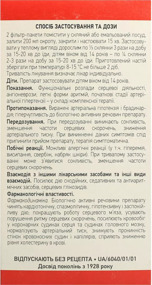 Взаємодія з іншими лікарськими засобами та інші види взаємодій. Посилює дію снодійних, седативних та антиаритмічних засобів, серцевих глікозидів. Особливості застосування. Застосування у період вагітності або годування груддю. Протипоказано. Здатність впливати на швидкість реакції при керуванні автотранспортом або іншими механізмами. На період лікування препаратом слід утримуватися від керування автотранспортом або роботи з іншими механізмами, оскільки можливе виникнення сонливості. Спосіб застосування та дози.У пачках: 1 столову ложку листя і квіток помістити в емальований посуд, залити 200 мл гарячої кип’яченої води, закрити кришкою і настоювати на киплячій водяній бані 15 хв. Охолодити при кімнатній температурі протягом 45 хв, процідити, залишок віджати до процідженого настою. Об’єм настою довести кип’яченою водою до 200 мл. Застосовувати у теплому вигляді дорослим по ⅓ склянки 3 рази на добу за 15-20 хв до їди, дітям віком від 14 років – по ¼ склянки 2-3 рази на добу за 15-20 хв до їди. Перед застосуванням настій збовтати.