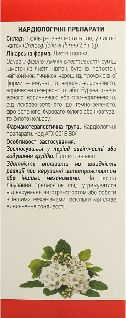 1 фільтр-пакет містить: глоду листя і квіток (Crataegi folia et flores) 1,5 г або 2,5 г.