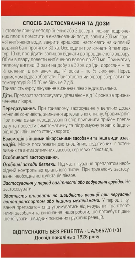 Застосування у період вагітності або годування груддю. Не застосовувати. Здатність впливати на швидкість реакції при керуванні автотранспортом або іншими механізмами. У період лікування препаратом слід утримуватись від керування транспортними засобами та виконання іншої роботи, що потребує підвищеної уваги, швидких психічних і рухових реакцій. Спосіб застосування та дози. 1 столову ложку неподрібнених або 2 десертні ложки подрібнених плодів помістити в емальований посуд, залити 200 мл гарячої кип’яченої води, закрити кришкою і настоювати на киплячій водяній бані протягом 30 хв. Охолодити при кімнатній температурі 10 хв, процідити, залишок віджати до процідженого відвару. Об’єм відвару довести кип’яченою водою до 200 мл. Приймати у теплому вигляді 3 рази на добу за30 хв до їди: дорослим – по в…“ склянки, дітям віком від 14 років – по Вј склянки.