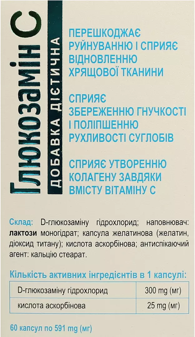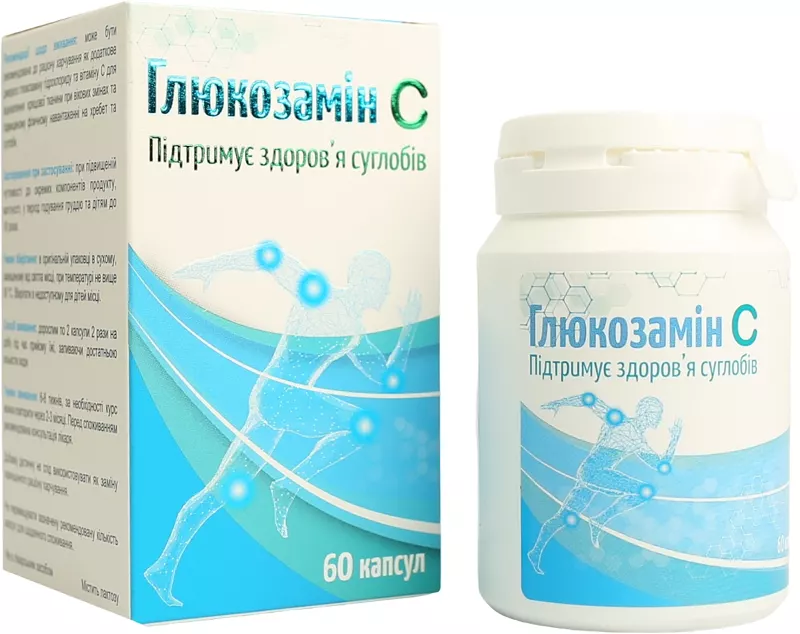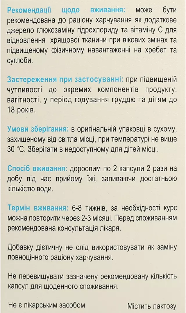 Добавка дієтична рекомендована до раціону харчування як додаткове джерело глюкозаміну гідрохлориду та вітаміну С для відновлення хрящової тканини при вікових змінах та підвищеному фізичному навантаженні на хребет та суглоби.