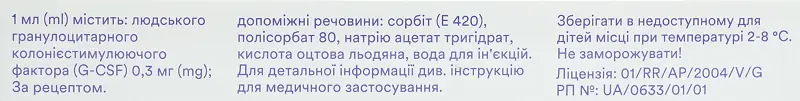 1 мл розчину містить людського гранулоцитарного колонієстимулюючого фактора (G-CSF) 0,3 мг (30 млн ОД або 300 мкг);
