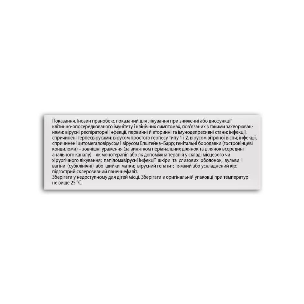 Показання.ІНОЗИН ПРАНОБЕКС показаний для лікування при зниженні або дисфункції клітинно-опосередкованого імунітету і клінічних симптомах, пов’язаних з такими захворюваннями: