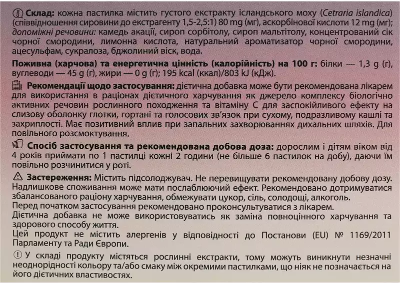 густого екстракту ісландського моху (Cetraria islandica) (співвідношення сировини до екстрагенту 1,5-2,5: 1) 80 мг,