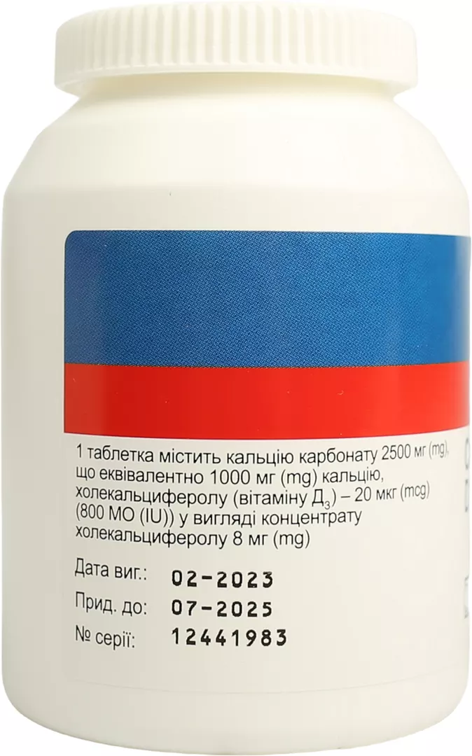 діюча речовина: 1 таблетка містить: кальцію карбонату 2500 мг, що еквівалентно 1000 мг кальцію, холекальциферолу (вітаміну Д3) – 20 мкг (800 МО) у вигляді концентрату холекальциферолу* 8 мг;