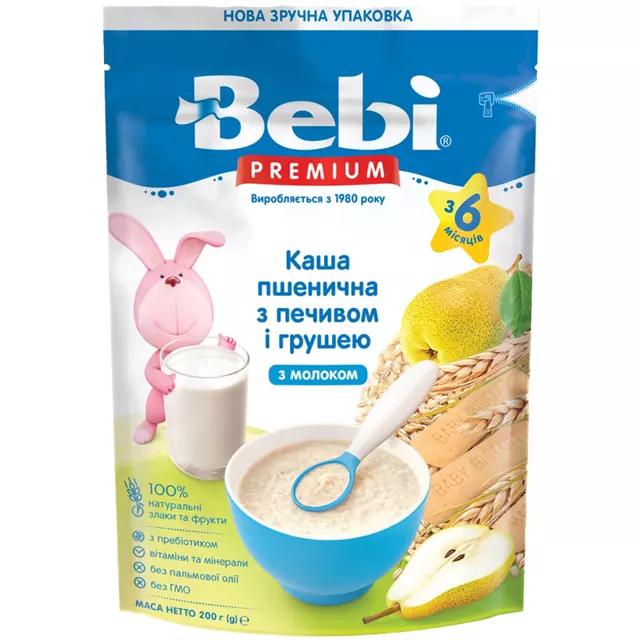 КАША МОЛОЧНА «ПШЕНИЧНА З ПЕЧИВОМ І ГРУШАМИ» ВІД 6 МІС BEBI PREMIUM
