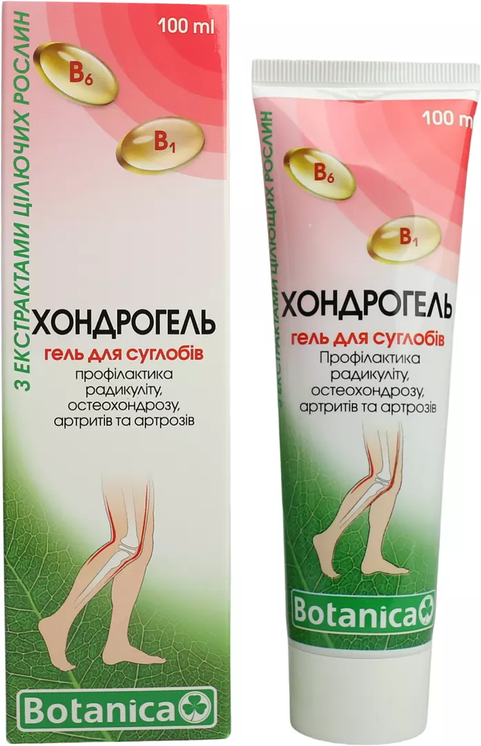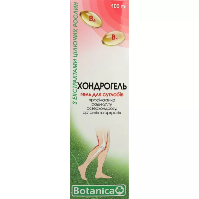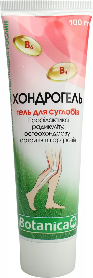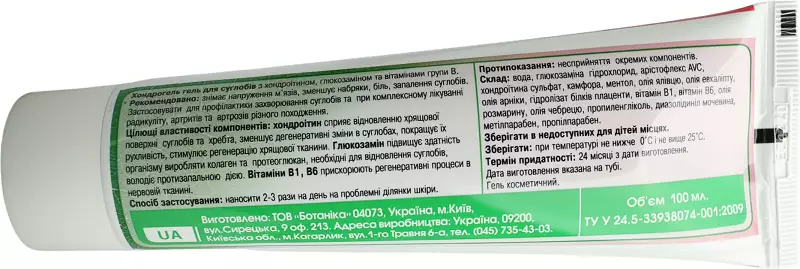 Склад. Вода, глюкозамін гідрохлорид, аристофлекс AVC, ПЕГ-40, хондроїтин сульфат, камфора, ментол, олія ялівцю, олія евкаліпта, олія арніки, гідролізат білків плаценти, вітамін В1, вітамін В6, олія розмарину, олія чебрецю, Діізолідин . Властивості. Хондрогель гель для суглобів з хондроїтином, глюкозаміном та вітамінами групи В.Цілющі властивості компонентів: Хондроїтин сприяє відновленню хрящових поверхонь суглобів та хребта, зменшує дегенеративні зміни у суглобах, покращує їх рухливість, стимулює регенерацію хрящової тканини. Глюкозамін підвищує здатність організму виробляти колаген та протеоглюкан, необхідні для відновлення суглобів, має протизапальну дію. Вітаміни В1, В6 прискорюють регенеративні процеси нервової тканини.