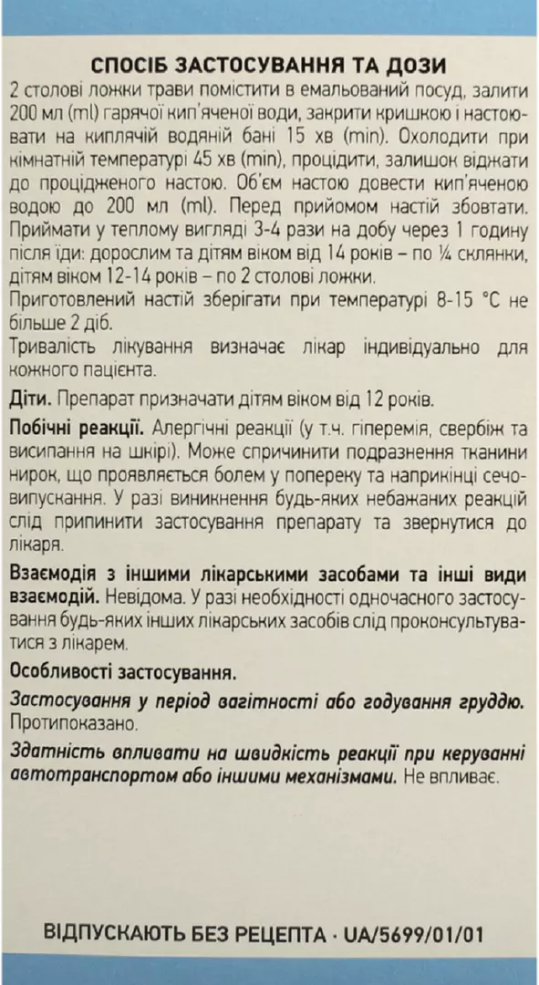 Взаємодія з іншими лікарськими засобами та інші види взаємодій. Невідома. У разі необхідності одночасного застосування будь-яких інших лікарських засобів слід проконсультуватися з лікарем. Особливості застосування. Застосування у період вагітності або годування груддю. Протипоказано. Здатність впливати на швидкість реакції при керуванні автотранспортом іншими механізмами. Не впливає. Спосіб застосування та дози.2 столові ложки трави помістити в емальований посуд, залити 200 мл гарячої кип’яченої води, закрити кришкою і настоювати на киплячій водяній бані 15 хв. Охолодити при кімнатній температурі 45 хв, процідити, залишок віджати до процідженого настою. Об’єм настою довести кип’яченою водою до 200 мл. Перед прийомом настій збовтати.