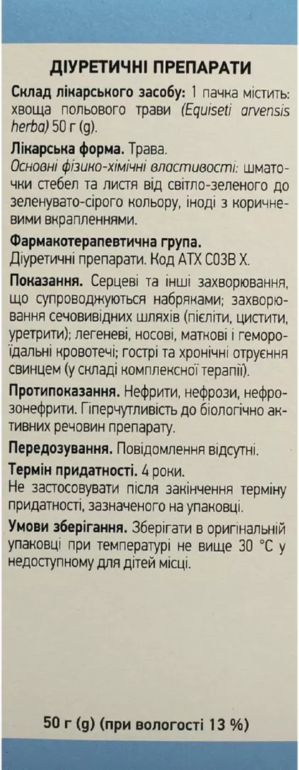 1 пачка містить: хвоща польового трави (Equiseti arvensis herba) 50 г;