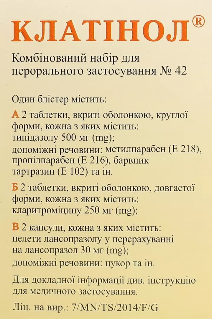 Упаковка.Комбінований набір для перорального застосування № 42: 2В таблетки жовтого кольору круглої форми (тинідазолу) + 2В таблетки жовтого кольору довгастої форми (кларитроміцину) + 2В капсули (лансопразолу) – у стрипі; по 7В стрипів у картонній пачці з маркуванням українською мовою.