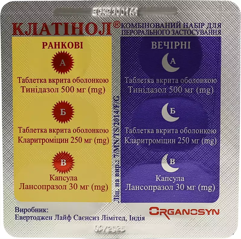 Спосіб застосування та дози.Рішення про схему лікування, дози препаратів та терміни лікування повинен приймати лікар. Рекомендована схема застосування та дозування: 1В стрип або блістер, що містить 2В капсули лансопразолу, 2В таблетки кларитроміцину та 2В таблетки тинідазолу, розрахований на 1добу лікування. Вранці приймати 1В капсулу лансопразолу і по 1В таблетці кларитроміцину та тинідазолу, ввечері повторити прийом препаратів.