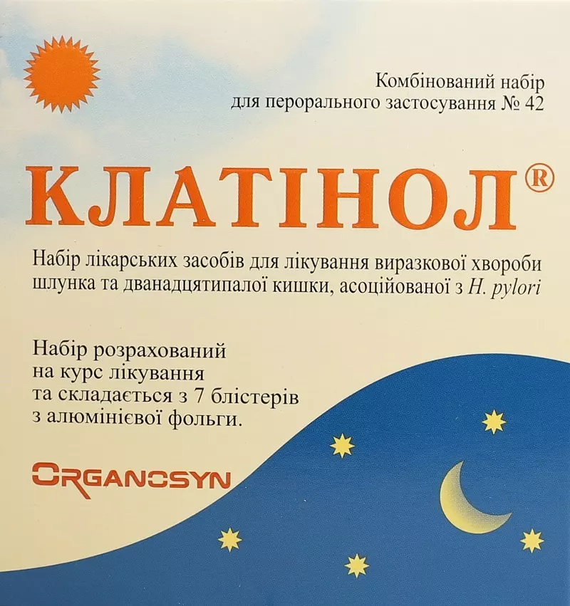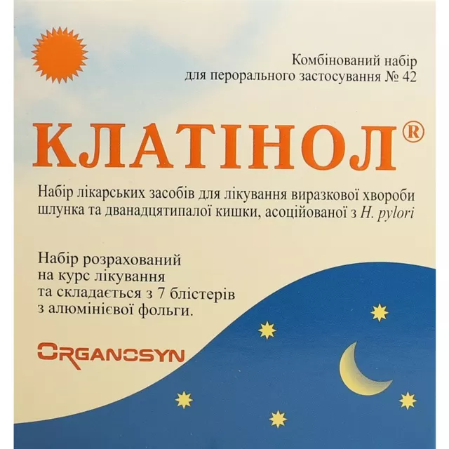 Комбінований набір для перорального застосування № 42: 2В таблетки жовтого кольору круглої форми (тинідазолу) + 2В таблетки жовтого кольору довгастої форми (кларитроміцину) + 2В капсули (лансопразолу) – у блістері; по 7В блістерів у картонній пачці з маркуванням українською мовою.