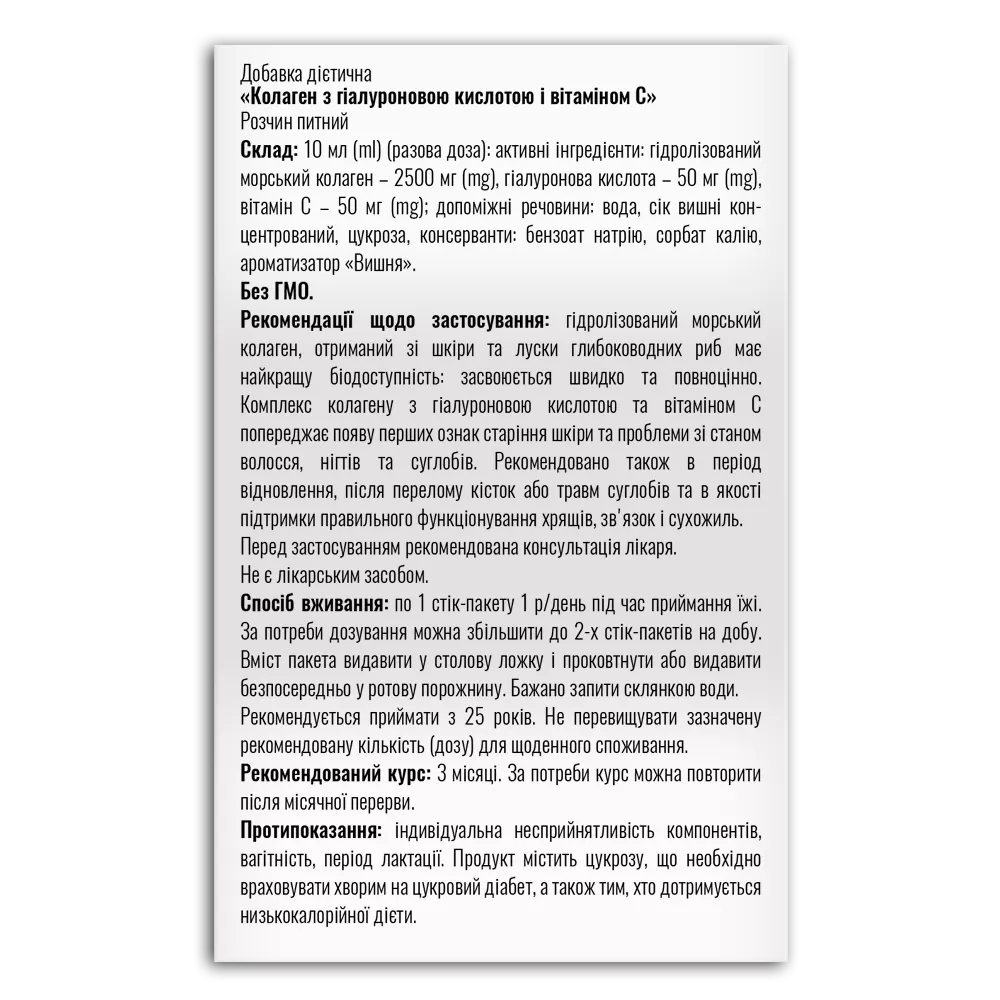 активні інгредієнти: гідролізований морський колаген – 2500 мг (mg), гіалуронова кислота – 50 мг(mg), вітамін С – 50 мг(mg);