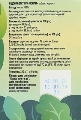 Рекомендації до застосування:Ксиліт рекомендується як природний замінник цукру при діабеті, підвищеному вазі, ожирінні, алергічних реакціях, холециститі. Речовина може бути використано як альтернативне джерело енергії при підвищених фізичних навантаженнях і заняттях спортом. Ксиліт використовуватися для проведення зондування.