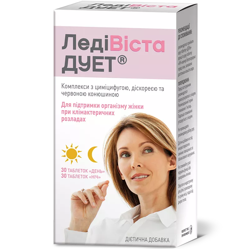 ЛедіВіста ДУЕТ- дієтична добавка на основі рослинних екстрактів, вітамінів та мінералів, які сприяють нормальному функціонуванню організму жінки в період переходу до менопаузи та під час клімаксу для зменшення клімактеричних розладів.