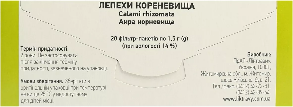 1 фільтр-пакет містить: лепехи кореневищ (Сalami rhizomata) 1,5 г.