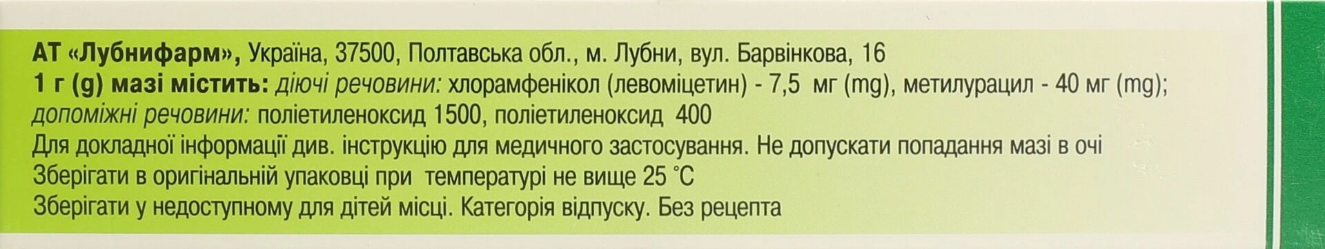 До складу препарату входять метилурацил та хлорамфенікол (левоміцетин). Хлорамфенікол (левоміцетин) має широкий спектр антимікробної дії по відношенню до грампозитивних і грамнегативних мікроорганізмів, включаючи стафілококи, синьогнійну і кишкову палички, забезпечує антибактеріальний ефект за рахунок порушення синтезу білка мікроорганізмів. Метилурацил прискорює процеси клітинної регенерації, сприяє загоєнню ран та чинить протизапальну дію, підвищує рівень місцевого імунітету, індукує інтерфероногенез, підсилює процеси клітинної регенерації, прискорює загоєння ран. У гнійній рані поліетиленоксид 1500 активно зв’язує запальний ексудат, віддаючи його у пов’язку, з якої рідина випаровується, а молекули поліетиленоксиду 1500, що звільнилися, знову приєднують до себе ексудат, що накопичується на дні рани. Найдрібніші молекули поліетиленоксиду 400 здатні проникати всередину тканин. Утворюючи з антибіотиком комплекс, поліетиленоксид 400 проводить його у тканини рани, де локалізуються мікроби. Таким чином, на тлі застосування препарату відбувається ліквідація перифокального набряку та очищення рани від гнійно-некротичного вмісту.