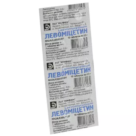 1 таблетка містить левоміцетину (хлорамфеніколу) 500 мг (0,5 г);