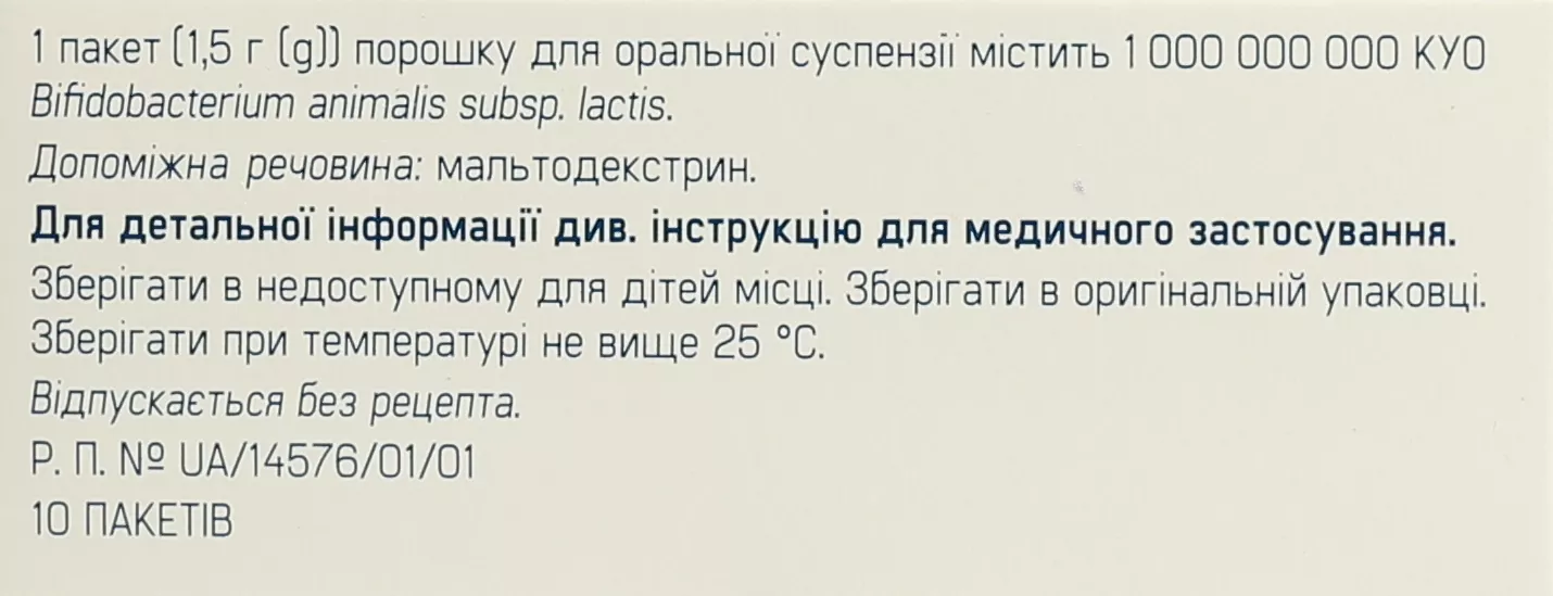 1 пакет (1,5 г) порошку для оральної суспензії містить 1В 000В 000В 000 КУО Bifidobacterium animalis subsp. lactis;