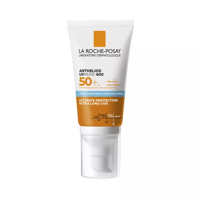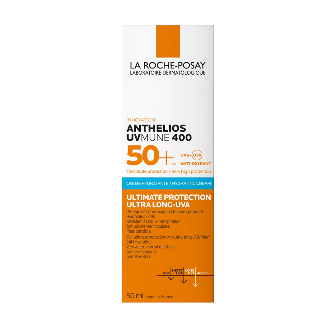 Антеліос UVA 400, сонцезахисний зволожуючий крем для обличчя та шкіри навколо очей з SPF50+ забезпечує дуже високий рівень захисту від UVB та UVA (у тому числі від дуже довгих UVA променів). Запатентована у Франції розробка La Roche-Posay – фільтр Мексорил 400, який забезпечує захист навіть від дуже довгих УФ-променів (частина сонячного спектру 380 – 400 нм), тим самим допомагає захистити клітини шкіри від пошкоджень УФ-променями. Це наш найефективніший1 захист від підступних найдовших УФ-променів. Особливості дуже довгих UVA променів. Чому важливо забезпечити захист від них? - Проникають найглибше у шкіру. За будь-якої погоди Навіть через скло
