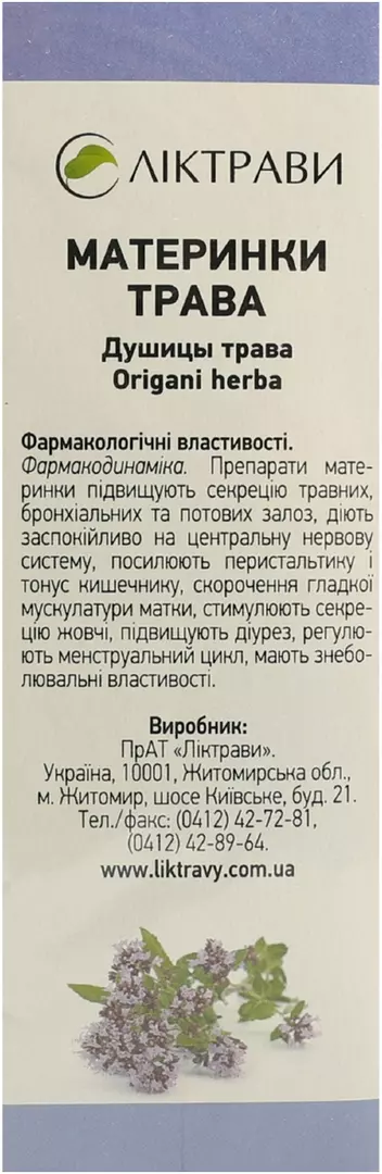 Фармакотерапевтична група. Препарати, що застосовуються при кашлі та застудних захворюваннях. Відхаркувальні засоби. Код АТХ R05C А. Фармакологічні властивості.Препарати материнки підвищують секрецію травних, бронхіальних та потових залоз, діють заспокійливо на центральну нервову систему, посилюють перистальтику і тонус кишечнику, скорочення гладкої мускулатури матки, стимулюють секрецію жовчі, підвищують діурез, регулюють менструальний цикл, мають знеболювальні властивості.