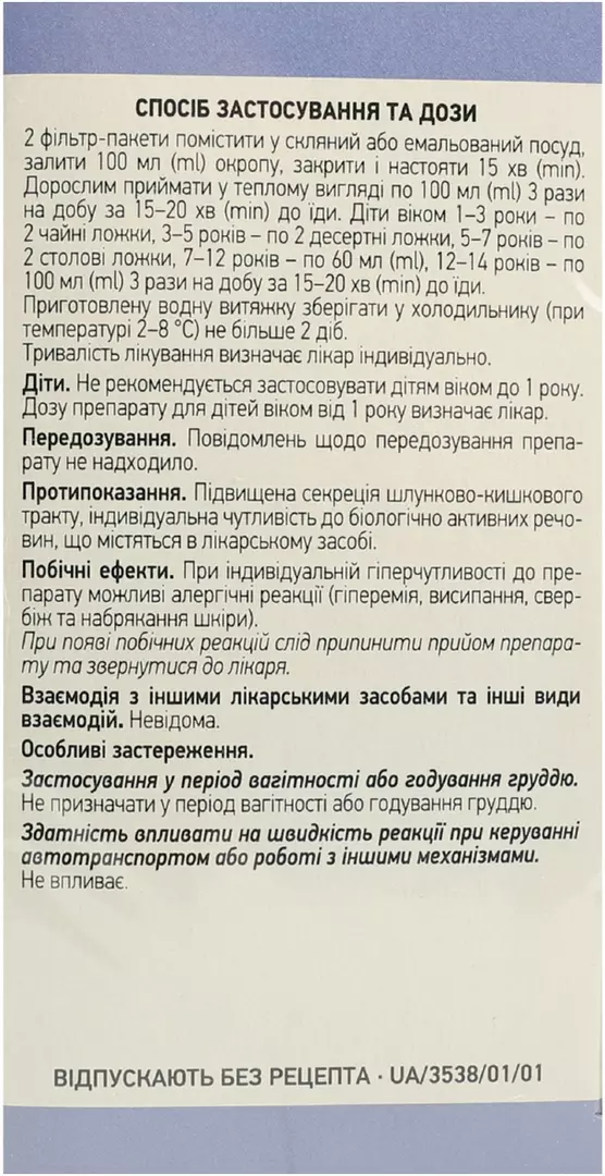2 фільтр-пакети помістити у скляний або емальований посуд, залити 100 мл окропу, закрити і настояти 15 хв. Дорослим приймати у теплому вигляді по 100 мл 3 рази на добу за 15-20 хв до їди. Діти віком 1-3 роки – по 2 чайні ложки, 3-5 років – по 2 десертні ложки, 5-7 років – по