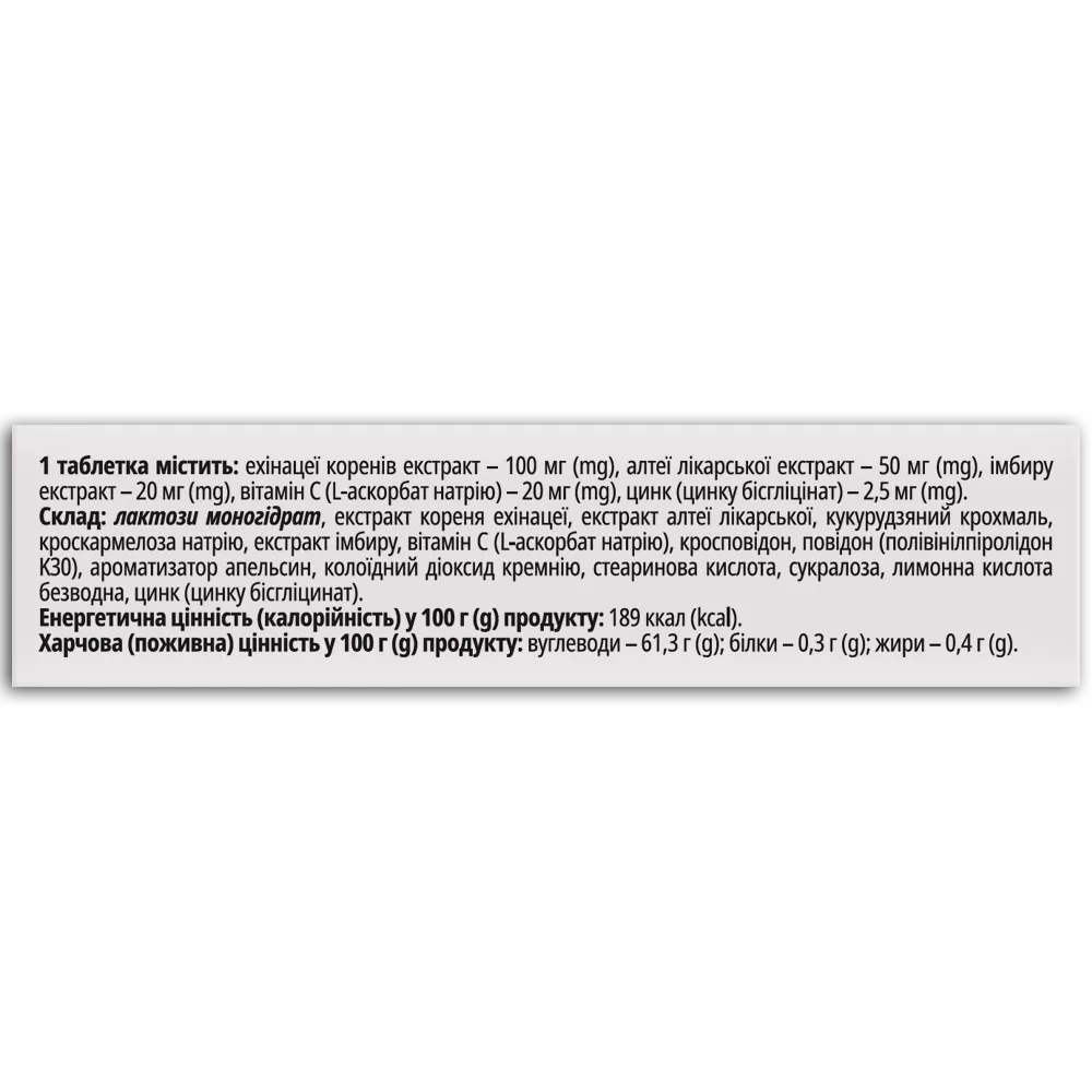 Склад: лактози моногідрат, екстракт кореня ехінацеї, екстракт алтеї лікарської, кукурудзяний крохмаль, кроскармелоза натрію, екстракт імбиру, вітамін С (L-аскорбат натрію), кросповідон, повідон (полівінілпіролідон K30), ароматизатор апельсин, колоїдний діоксид кремнію, стеаринова кислота, сукралоза, лимонна кислота безводна, цинк (цинку бісгліцинат).