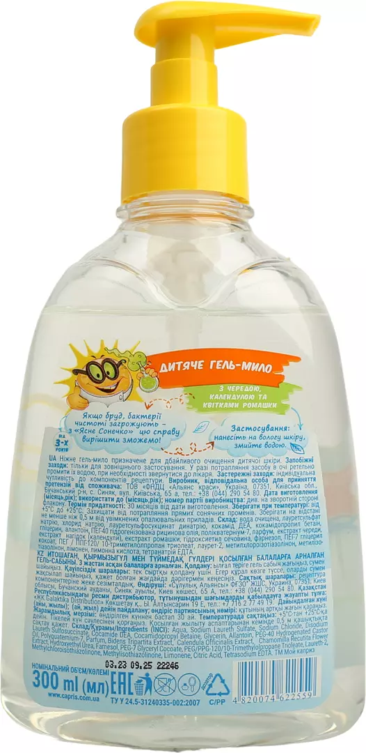 Ніжне ароматне гель-мило дбайливо очищає шкіру від забруднень і бактерій, забезпечуючи гігієнічний догляд за чутливою шкірою дитини. Дитяче гель-мило збагачене екстрактами череди, календули, ромашки, які виявляють протизапальну, антисептичну дії. Мило також містить алантоїн, який надає заспокійливий ефект.