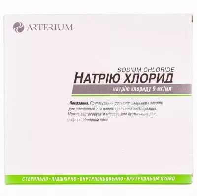 Взаємодія з іншими лікарськими засобами та інші види взаємодій. Лікарський засіб сумісний з більшістю лікарських засобів, тому його слід застосовувати для розчинення різних лікарських засобів – за винятком тих препаратів, що несумісні з натрію хлоридом як розчинником. Особливості застосування. Перед розчиненням лікарського засобу слід перевірити, чи можливе застосування розчину натрію хлориду для розчинення даного лікарського засобу. Застосування у період вагітності або годування груддю. Препарат можна застосовувати у період вагітності або годування груддю. Здатність впливати на швидкість реакції при керуванні автотранспортом або іншими механізмами. Не впливає. Спосіб застосування та дози. Застосовувати внутрішньовенно, внутрішньом’язово або ректально, підшкірно (залежно від рекомендованого способу застосування). Для промивання ран, слизових оболонок розчин застосовувати у достатній кількості. Діти. Препарат можна застосовувати дітям. Передозування. При правильному застосуванні малоймовірне. Побічні реакції. Не спостерігаються при правильному застосуванні лікарського засобу. Термін придатності. 5 років. Умови зберігання.Зберігати при температурі не вище 25 ºС.