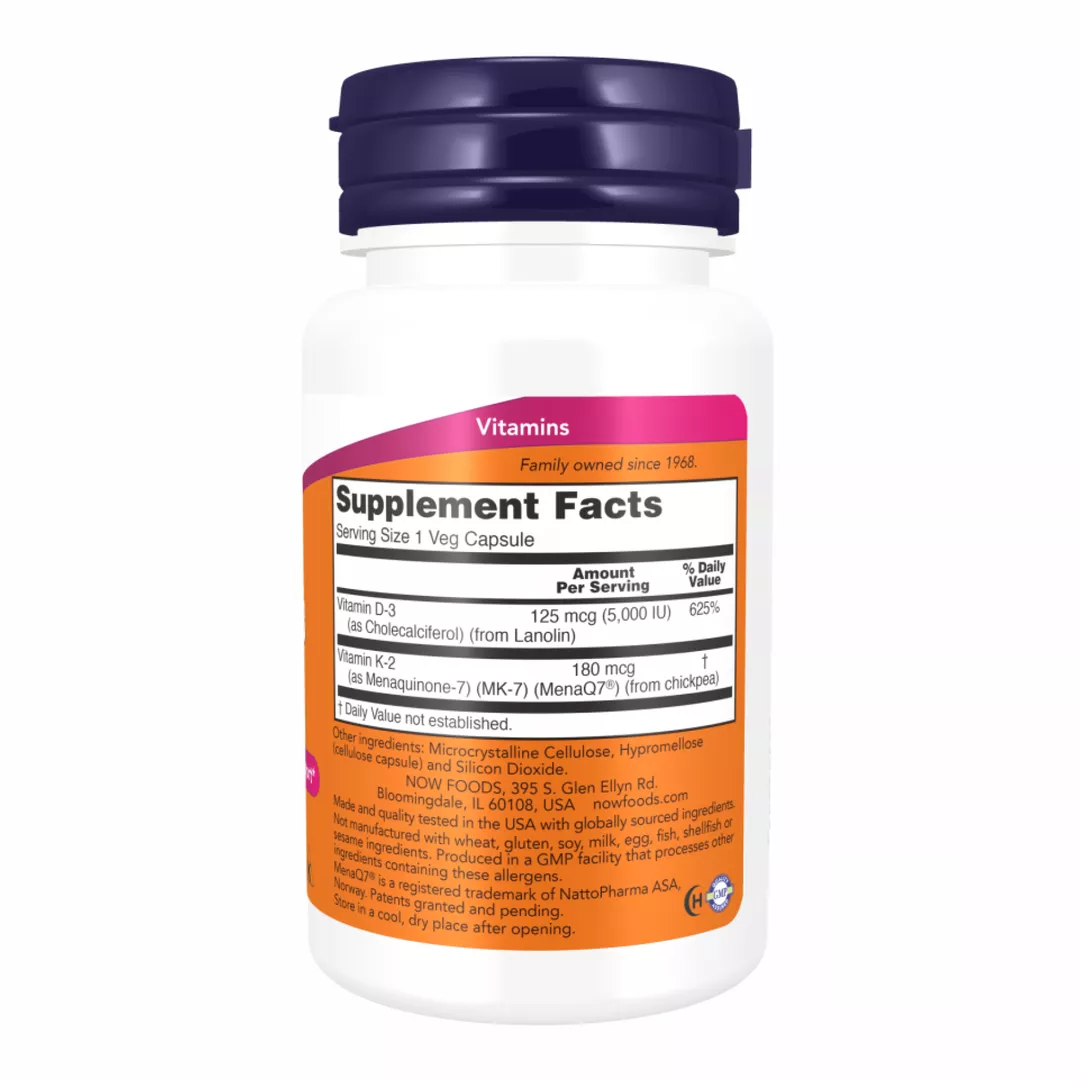 Добавка «Мега D3 та MK-7» від NOW® поєднує в собі вітаміни D3 та K2, дві поживних речовини, роль яких у підтримці здоров’я кісток, зубів і серцево-судинної системи ретельно досліджувалася. Вітамін D3 разом із кальцієм підтримує здоров’я кісток, і нещодавні дослідження показують, що він важливий для здоров’я імунної системи. MK-7 MenaQ7® — це унікальна біодоступна форма вітаміну K2 без сої, яка відіграє вирішальну роль у здоров’ї артерій завдяки своїй здатності підтримувати належний метаболізм кальцію в кровоносних судинах і артеріях. Вітамін К2 також важливий для формування міцних, здорових кісток.