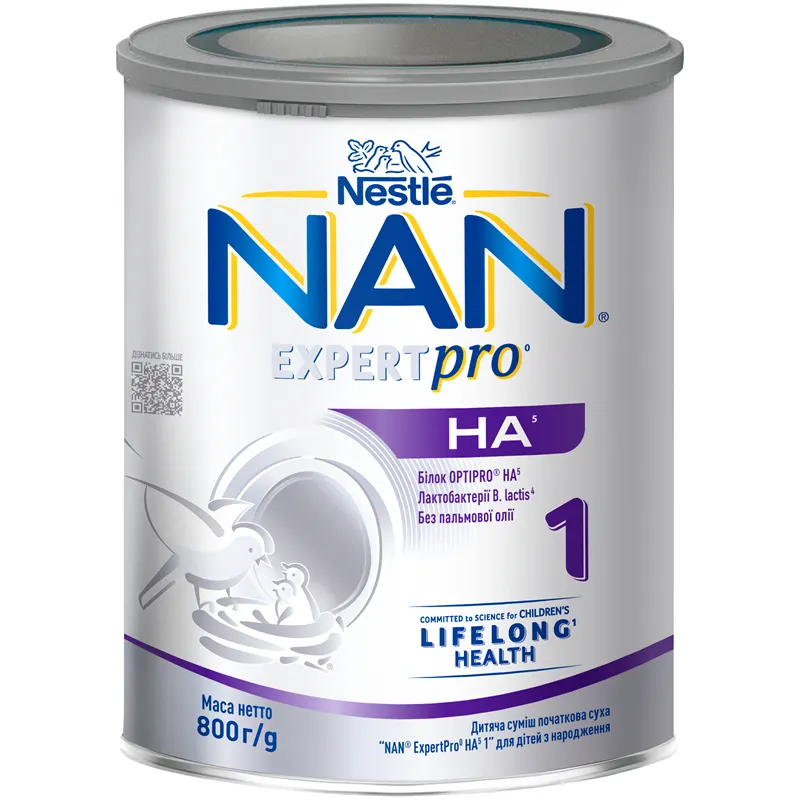 Повноцінне харчування дитяча суміш початкова суха "NAN® ExpertPro HA 1" для дітей з народження — це суміш для немовлят із ризиком розвитку алергії, яка містить наш унікальний частково гідролізований білок.