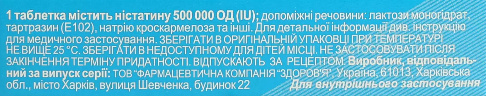 1 таблетка|таблетку| містить|утримує| ністатину у перерахуванні на 4500 ОД/мг і суху речовину 111,1 мг або 500000 ОД|;