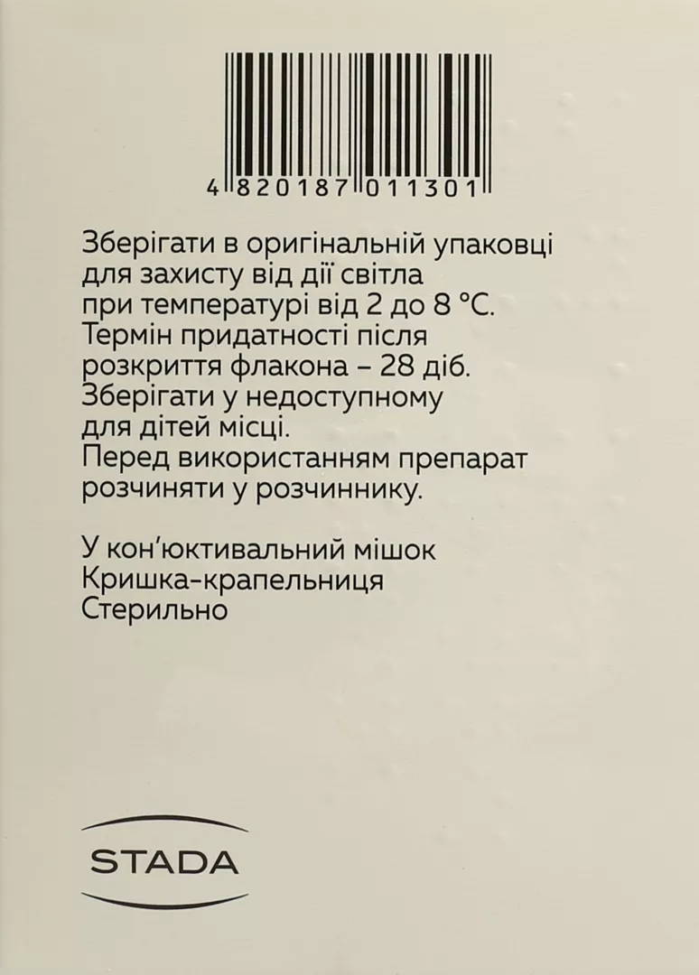 Термін придатності. 2 роки. Умови зберігання. Зберігати в оригінальній упаковці для захисту від дії світла при температурі від 2 до 8°С. Зберігати в недоступному для дітей місці. Термін придатності після відкриття флакона – 28 діб. Упаковка. По 1 000 000 МО препарату у скляному флаконі. По 5 мл розчинника у скляній ампулі. Додається поліетиленова кришка-крапельниця. Категорія відпуску. Без рецепта. Виробник. ТОВ «ФЗ «БІОФАРМА», Україна.Місцезнаходження виробника та його адреса місця провадження діяльності.