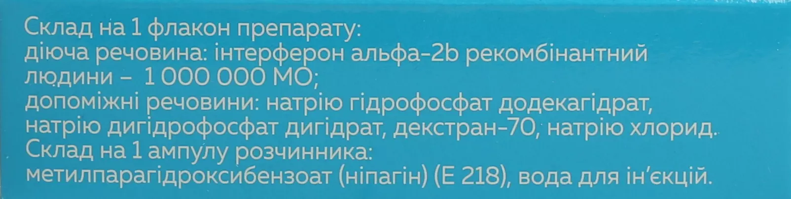 діюча речовина: 1 флакон препарату містить інтерферону альфа-2b рекомбінантного людини 1 000 000 МО;