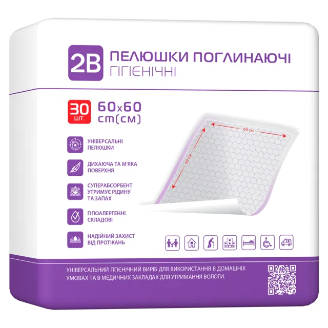 Пелюшки 2B одноразові гігієнічні поглинаючі, 60 x 60 см, 30 шт