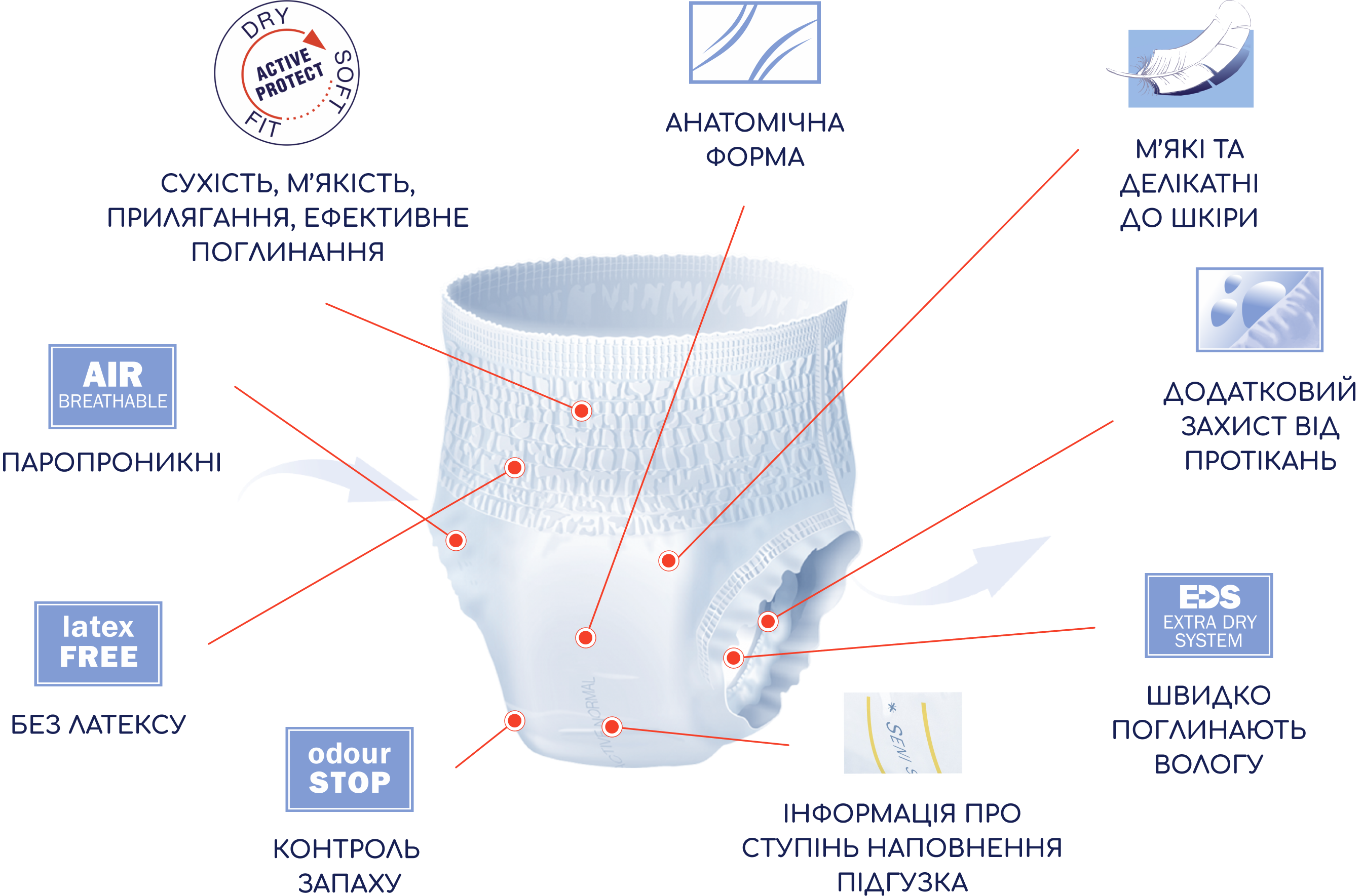 Завдяки антибактеріальному суперабсорбенту трусики добре поглинають та утримують вологу всередині, а також нейтралізують неприємні запахи. Спеціальний розподіляючий шар EDS забезпечує швидке і
