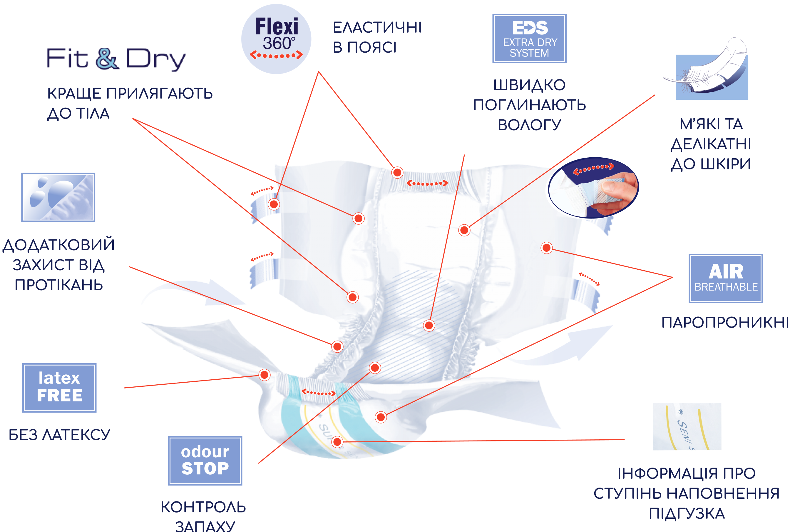 Попередження неприємного запаху сечі - суперабсорбент, що використовується в підгузках Super Seni, має сильні абсорбуючі властивості - він поглинає рідину і зв'язує її в гель, одночасно зменшуючи виділення неприємного запаху.