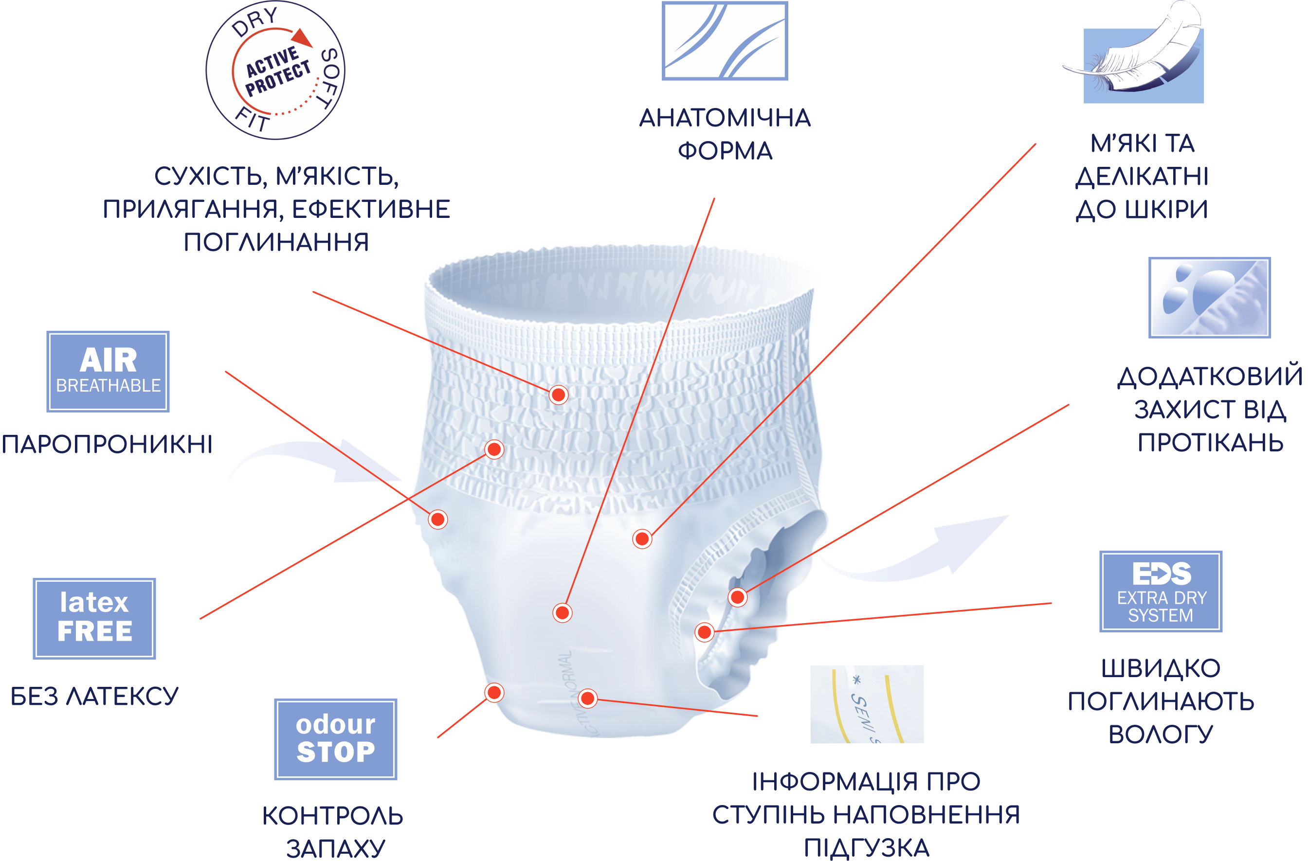 Завдяки антибактеріальному суперабсорбенту трусики добре поглинають та утримують вологу всередині, а також нейтралізують неприємні запахи. Спеціальний розподіляючий шар EDS забезпечує швидке і