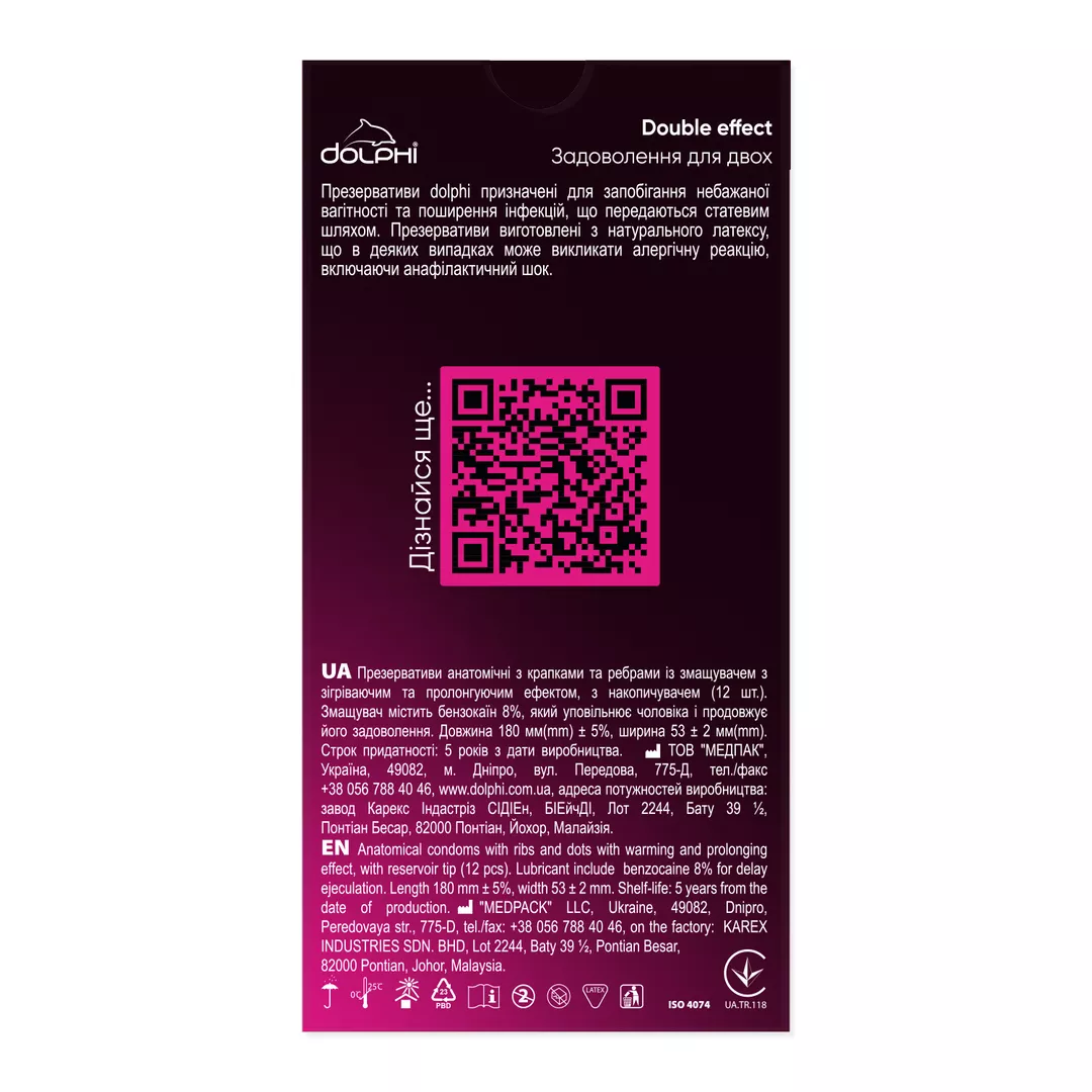 Презервативи Dolphi Double Effect створені для подвійного задоволення. Неймовірно, але це реально! Анестетик всередині Dolphi Double Effect здатний уповільнити еякуляцію та дозволить партнерам не турбуватися про ранній фінал, а розігріваючий гель на текстурованій поверхні презервативів здатний миттєво розігріти тіло жінки, що прискорить отримання феєричного оргазму.