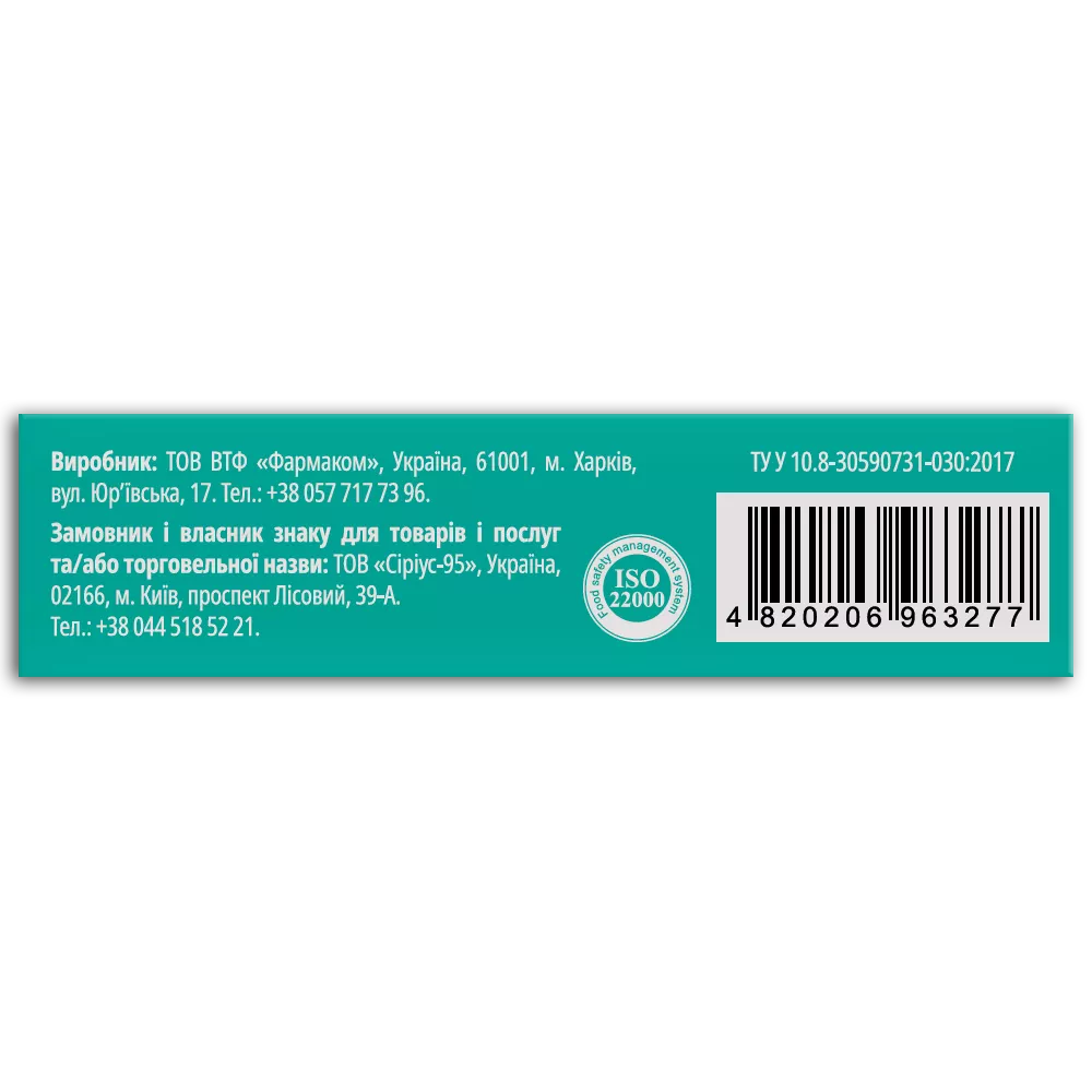 Виробник: ТОВ ВТФ «Фармаком», Україна, 61001, м. Харків, вул. Юр’ївська, 17.Тел.: +38 057 717 73 96