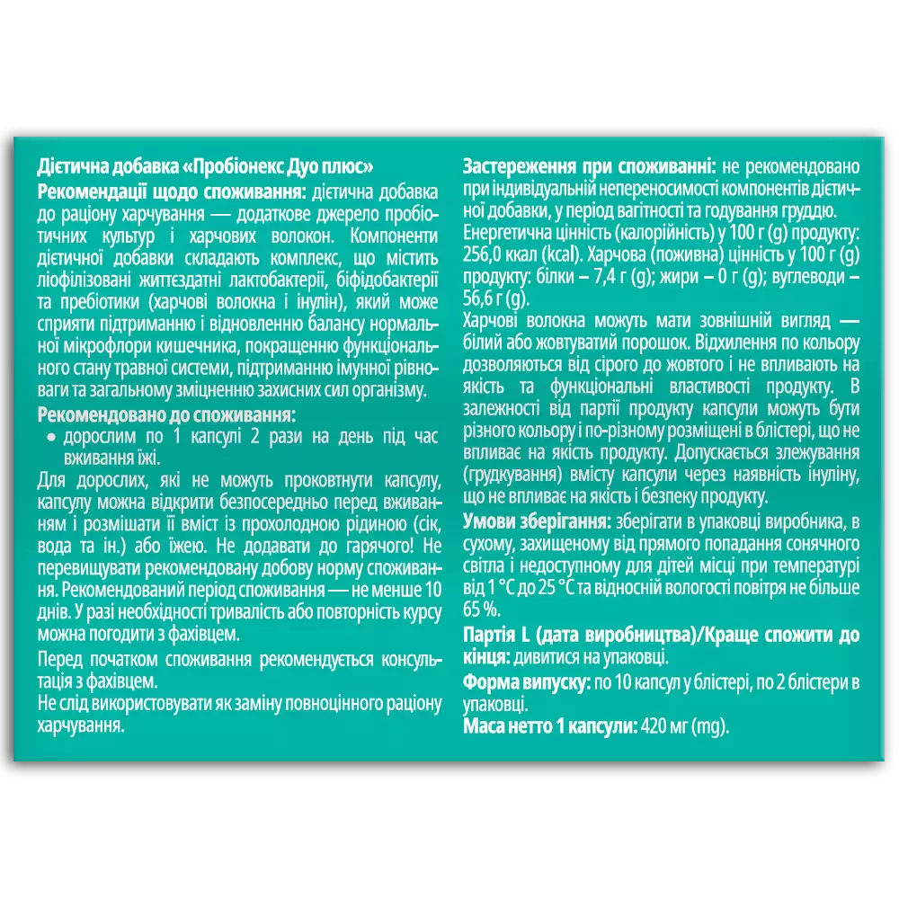 Склад на 1 капсулу масою нетто 420 мг (mg): інулін (Бельгія) – 59,52 % (250,0 мг (mg)), харчові волокна (США) – 37,161 % (156,0 мг (mg)), антиспікаючий агент кальцію стеарат – 2,0 %, антиспікаючий агент діоксид кремнію – 1,0 %, комплекс лакто- і біфідобактерій (Італія) – 0,319 % (1,34 мг (mg), у т. ч. Lactobacillus bulgarricus – 0,34*108 КУО, Streptococcus thermophilus – 0,33*108 КУО, Bifidobacterium infantis - 0,33*108 КУО); оболонка капсули: желатин. Рекомендації щодо споживання: дієтична добавка до раціону харчування — додаткове джерело пробіотичних культур і харчових волокон. Компоненти дієтичної добавки складають комплекс, що містить ліофілізовані життєздатні лактобактерії, біфідобактерії та пребіотики (харчові волокна і інулін), який може сприяти підтриманню і відновленню балансу нормальної мікрофлори кишечника, покращенню функціонального стану травної системи, підтриманню імунної рівноваги та загальному зміцненню захисних сил організму.Рекомендовано до споживання: дорослим по 1 капсулі 2 рази на день під час вживання їжі. Для дітей і дорослих, які не можуть проковтнути капсулу, капсулу можна відкрити безпосередньо перед вживанням і розмішати її вміст із прохолодною рідиною (сік, вода та ін.) або їжею. Не додавати до гарячого! Не перевищувати рекомендовану добову норму споживання. Рекомендований період споживання — не менше 10 днів. У разі необхідності тривалість або повторність курсу можна погодити з фахівцем.