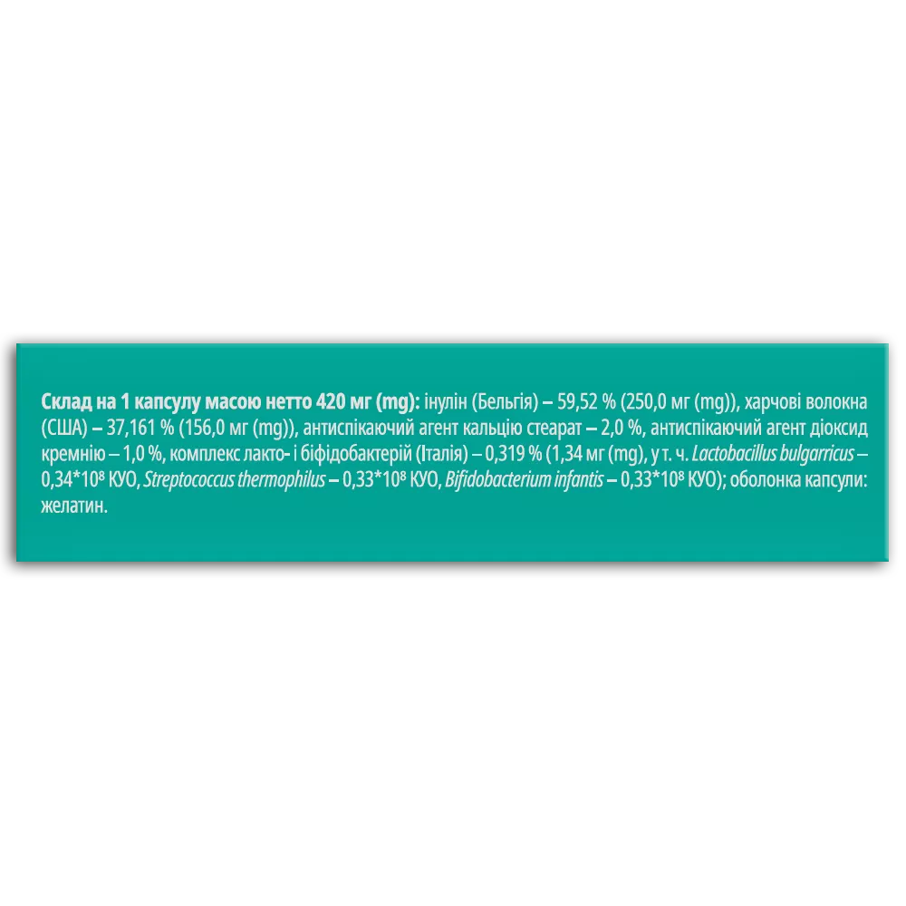 на 1 капсулу масою нетто 420 мг (mg): інулін (Бельгія) – 59,52 % (250,0 мг (mg)), харчові волокна (США) – 37,161 % (156,0 мг (mg)), антиспікаючий агент кальцію стеарат – 2,0 %, антиспікаючий агент діоксид кремнію – 1,0 %, комплекс лакто- і біфідобактерій (Італія) – 0,319 % (1,34 мг (mg), у т. ч. Lactobacillus bulgarricus – 0,34*108 КУО, Streptococcus thermophilus – 0,33*108 КУО, Bifidobacterium infantis - 0,33*108 КУО); оболонка капсули: желатин.