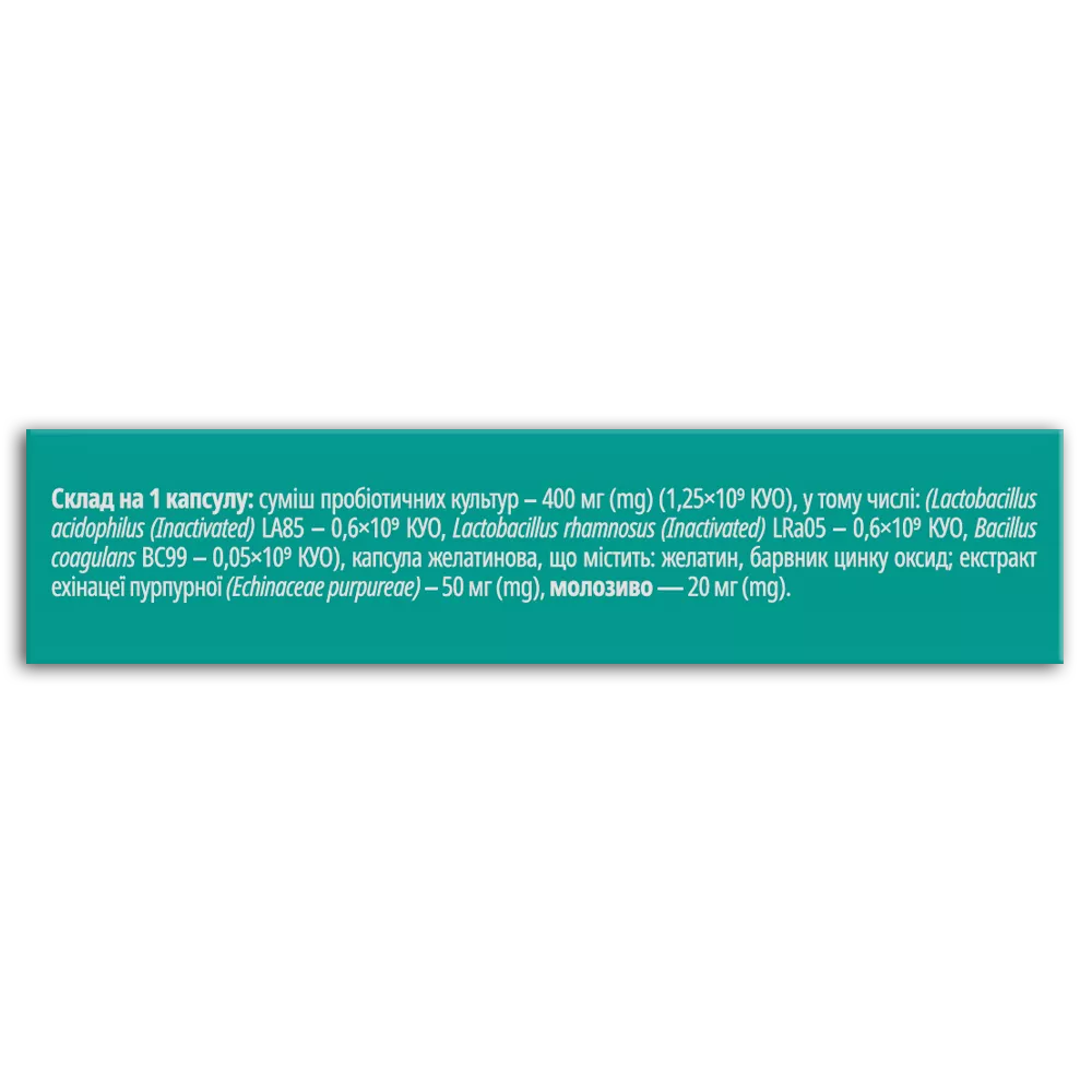 на 1 капсулу: суміш пробіотичних культур – 400 мг (mg) (1,25×10 9 КУО), у тому числі: (Lactobacillus acidophilus (Inactivated) LA85 – 0,6×10 9 КУО, Lactobacillus rhamnosus (Inactivated) LRa05 – 0,6×10 9 КУО, Bacillus coagulans BC99 – 0,05×10 9 КУО), капсула желатинова, що містить: желатин, барвник цинку оксид; екстракт ехінацеї пурпурної (Echinaceae purpureae) – 50 мг (mg), молозиво — 20 мг (mg).