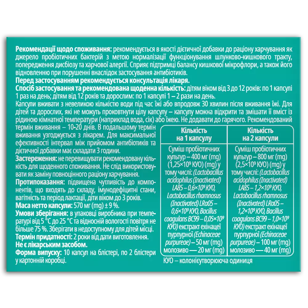Рекомендований термін вживання – 10-20 днів. В подальшому термін вживання узгоджується з лікарем. Для максимальної ефективності інтервал між прийомом антибіотиків та дієтичної добавки має складати 3 години. Застереження: не перевищувати рекомендовану кількість для щоденного споживання. Не слід використовувати як заміну повноцінного раціону харчування. Протипоказання: підвищена чутливість до компонентів, що входять до складу, імунодефіцитні стани, вагітність та період лактації, діти віком до 3 років.Маса нетто капсули: 570 мг (mg) %.