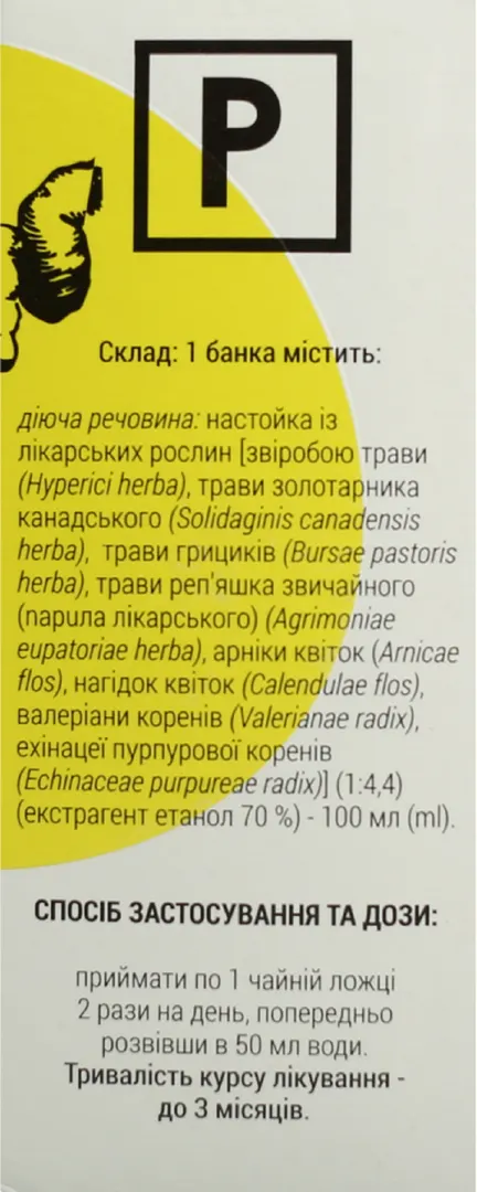 діюча речовина: 1 флакон (банка) містить настойки із лікарських рослин [звіробою трави (Hyperici herba), трави золотарника канадського (Solidaginis canadensis herba), трави грициків (Bursae pastoris herba), трави реп’яшка звичайного (парила лікарського) (Agrimoniae eupatoriae herba), арніки квіток (Arnicae flos), нагідок квіток (Calendulae flos), валеріани коренів (Valerianae radiх), ехінацеї пурпурової коренів (Echinaceae purpureae radix)] (1 : 4,4) (екстрагент етанол 70 %) – 100 мл;