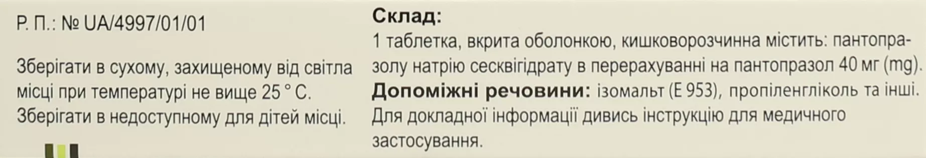 1 таблетка містить пантопразолу натрію сесквігідрату у перерахуванні на пантопразол 40 мг;