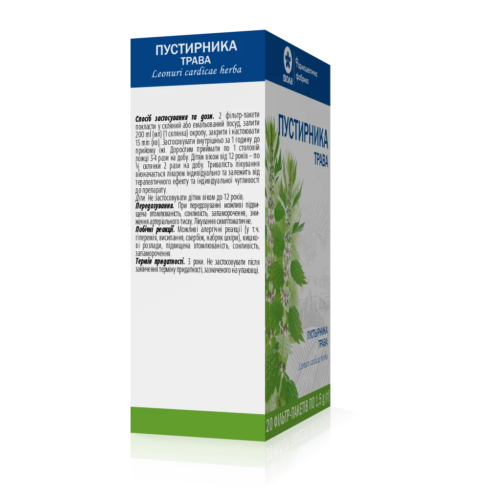 1 пачка містить трави пустирника (Leonuri cardiacae herba) – 50 г або 100 г; 1 фільтр-пакет містить трави пустирника (Leonuri cardiacae herba) – 1,5 г.