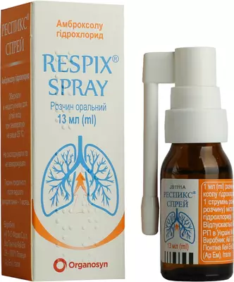 «Респикс спрей оральний розчин 10 мг/0,2 мл флакон 13 мл, ITC FARMA, S.r.L (Італія)» – це лікарський засіб, який застосовується при захворюваннях дихальної системи, що супроводжуються порушенням виведення слизу, а також для полегшення болю в горлі при респіраторних інфекціях. Основною діючою речовиною є амброксолу гідрохлорид – муколітик із секретолітичною та місцевоанестезуючою дією. Препарат випускається у формі орального розчину зі спрей-дозатором (по 13 мл у флаконі) та відпускається без рецепта.